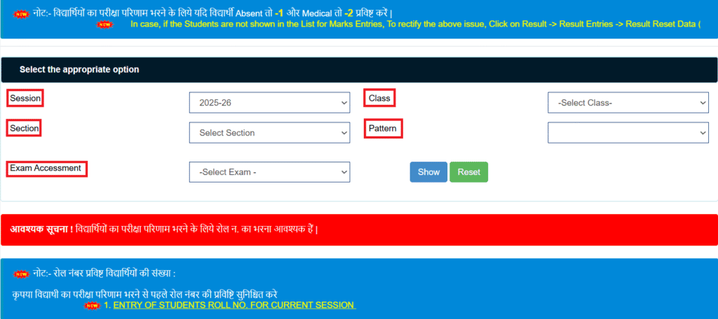 - Class: आप जिस कक्षा के अंको की प्रविष्ठी करना चाहते है उस कक्षा को चुने |