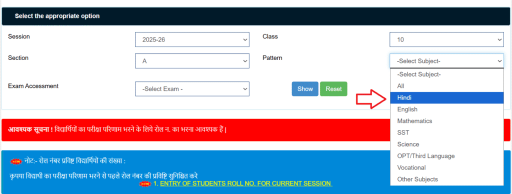 - Pattern: कक्षा के विषय का चयन करें | सहजता के लिए यदि आप अंक प्रविष्ट करना चाहते है तो एक विषय का ही चयन करें और यदि अंक प्रविष्ठी की जाँच करनी है तब ALL विकल्प का चयन करें |